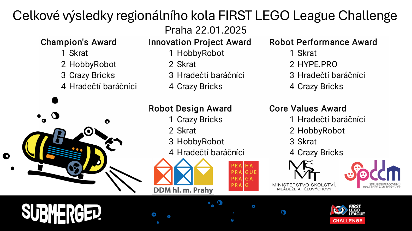 V sobotu 22.01.2025 se v Karlínském Spektru odehrál první ze čtyř regionálních turnajů. Celkem se zúčastnilo 15 týmů, nejen z Prahy a okolí. Nejlépe si v disciplíně Robot Performance vedl tým Skrat, disciplíny Innovation project se nejlépe zhostil HobbyRobot, Robot Design ovládl Skrat a nejlepší Core Values předvedl tým Hradečtí baráčníci. Tři nejlepší týmy postupují do národního finále, které se bude konat 22.03.2025 v sídle společnosti FANUC.